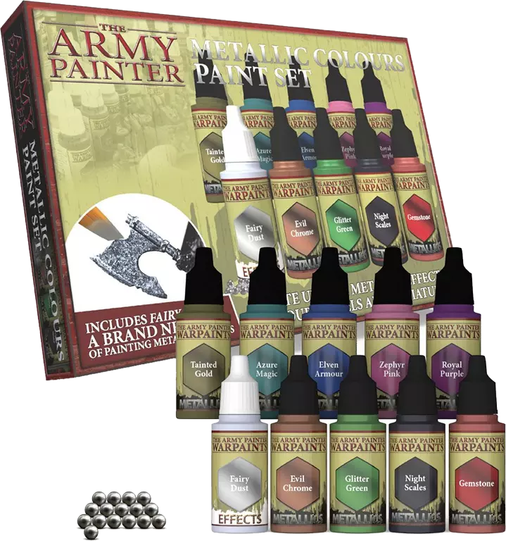 Want to paint magical armour, alien weaponry, or tainted treasure? Or perhaps the glistening, draconic hide of fantastic beasts? This paint set has you covered! Along with a wide array of metallic colours, we have also included our brand-new Metallic Effects paint - Fairy Dust. With this new paint, you can turn any of our Warpaints into a vibrantly shimmering metallic with a single coat. Our paint comes in spill-proof 18 ml./ 0.6 fl. oz. dropper bottles - perfect for both wet palettes and airbrushing. Our non-toxic, water-based paints have a creamy viscosity making it ideal for miniature painting, and they mix smoothly with each other to create any combination of colors that you dream up!
