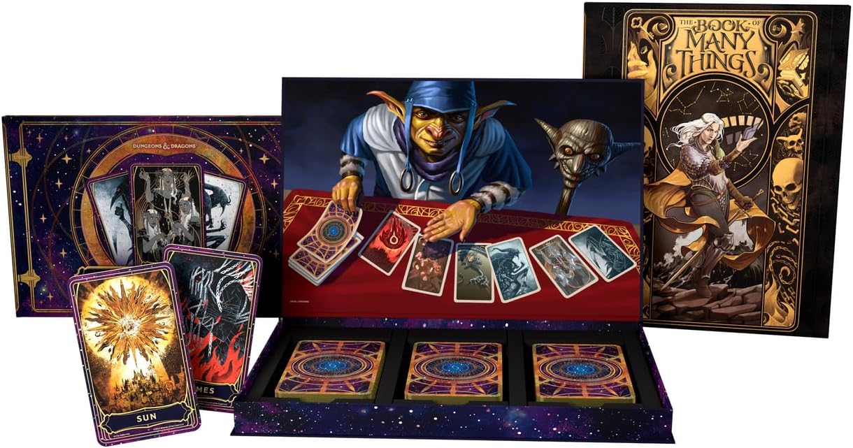 - The Deck of Many Things Card Reference Guide (80-page hardcover)—Deck guidebook showcasing each card in the expanded deck and a variety of ways the deck can be used